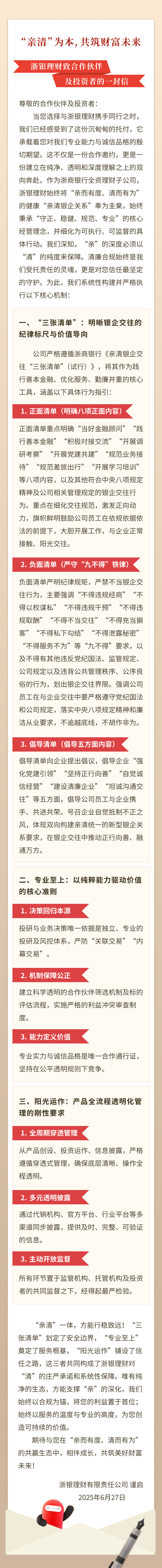 “亲清”为本,共筑财富未来——浙银理财致合作伙伴及投资者的一封信